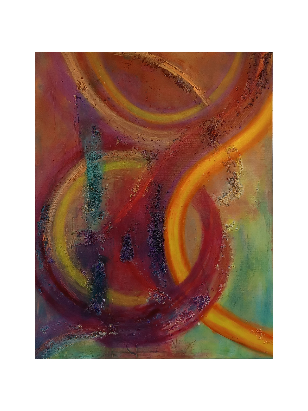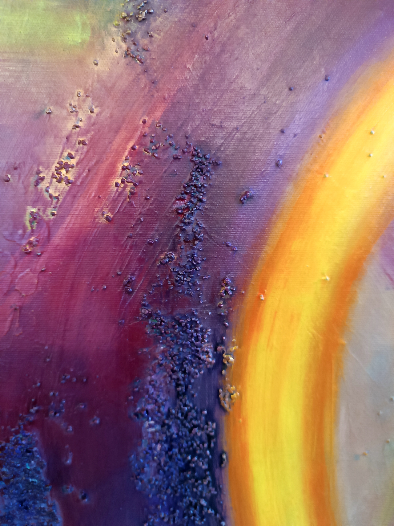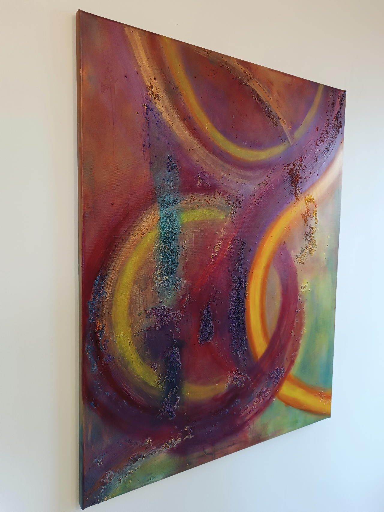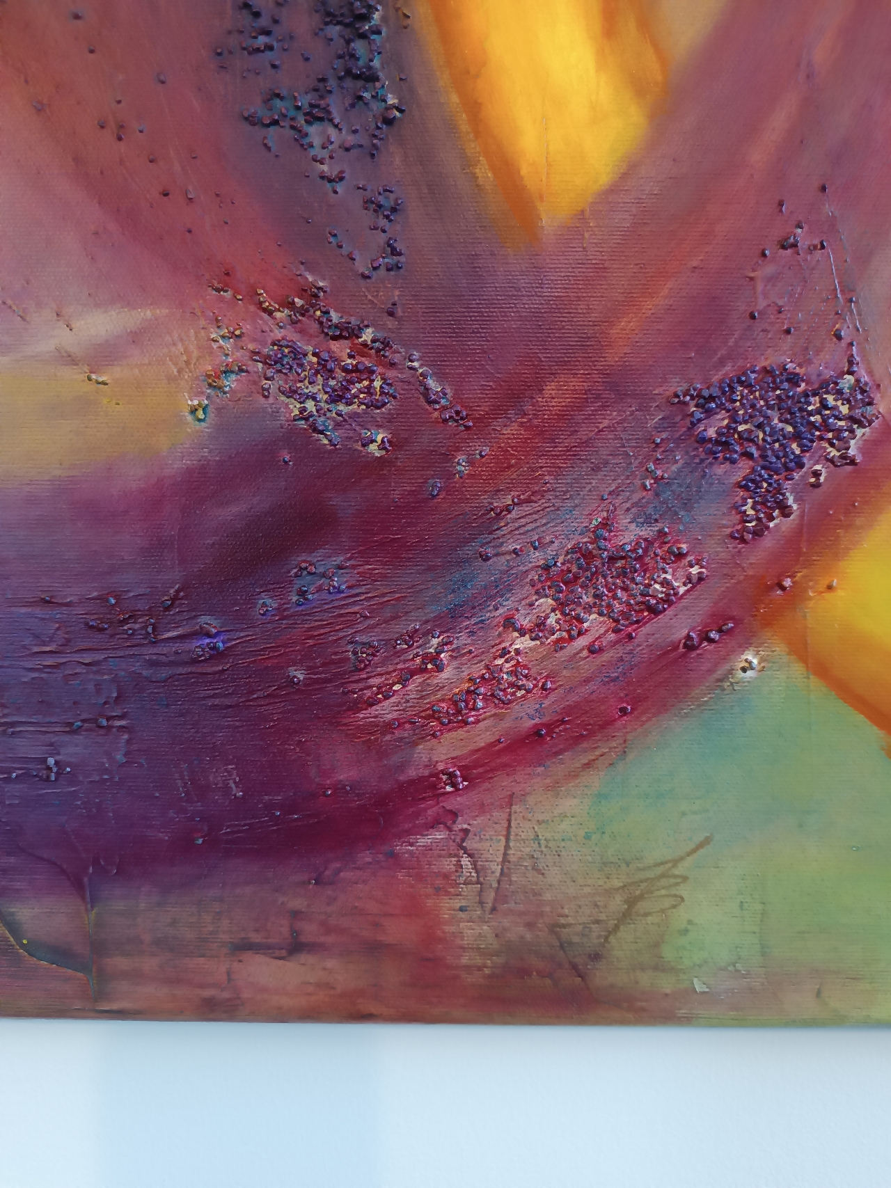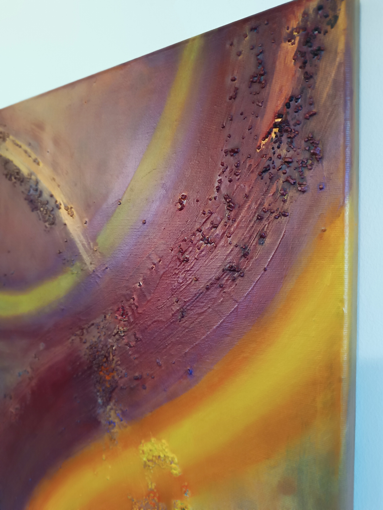 Obraz malowany pastami strukturalnymi i farbami akrylowymi, pięknie odbija światło dzięki metalicznym kolorom. W zależności od kąta jego padania, będzie przybierał mniej lub bardziej intensywne odcienie. Ożywi każde, nawet ciemne wnętrze.