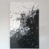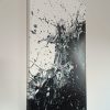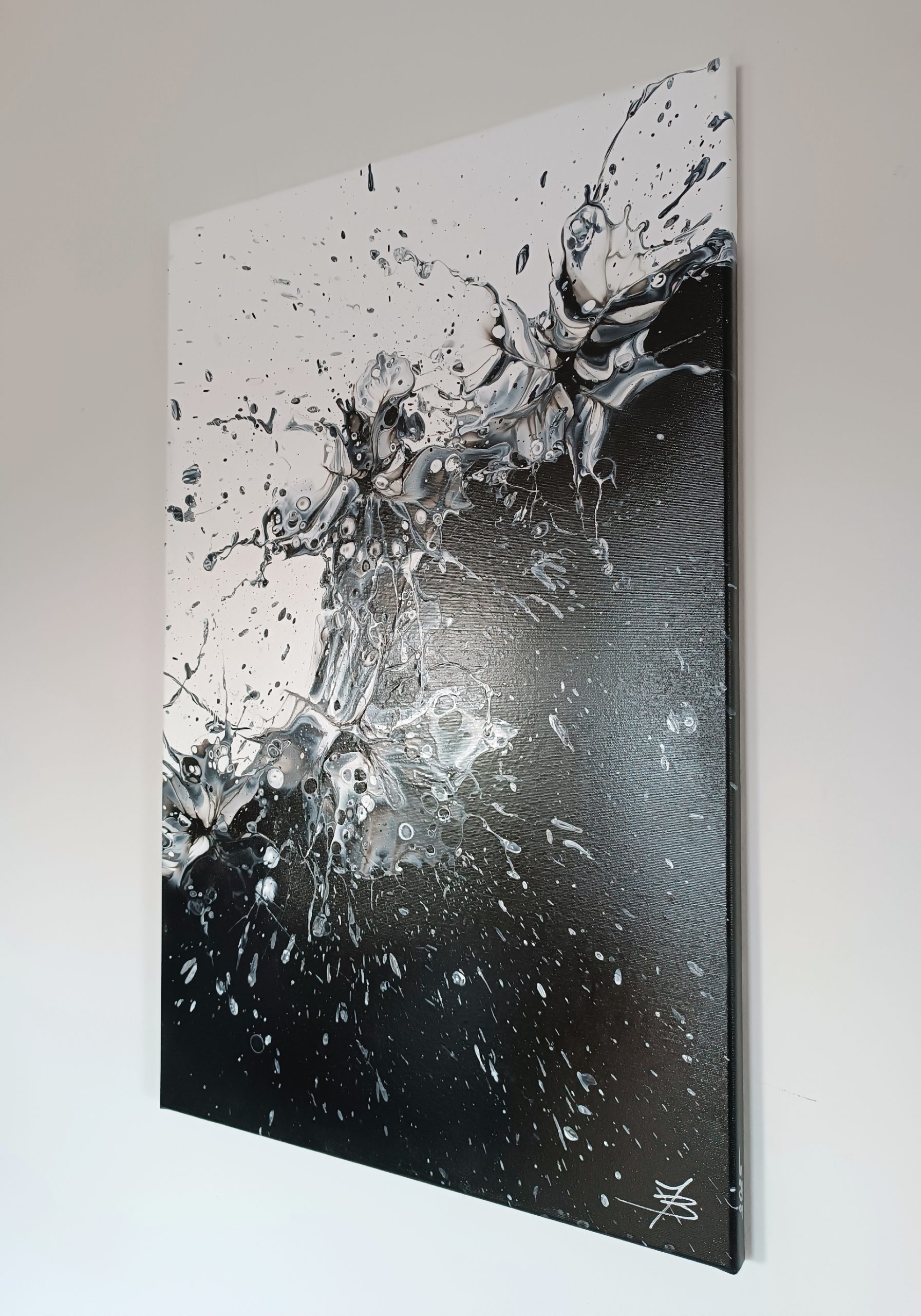 Akryl na płótnie techniką pouringu, motyw czarno-białych kwiatów. Kwiaty są rozchlapane i nieoczywiste, ale gdzieś tam można już je rozpoznać. To symbol tej fazy przejściowej, fazy chaosu, z którego wyłania się coś nowego.