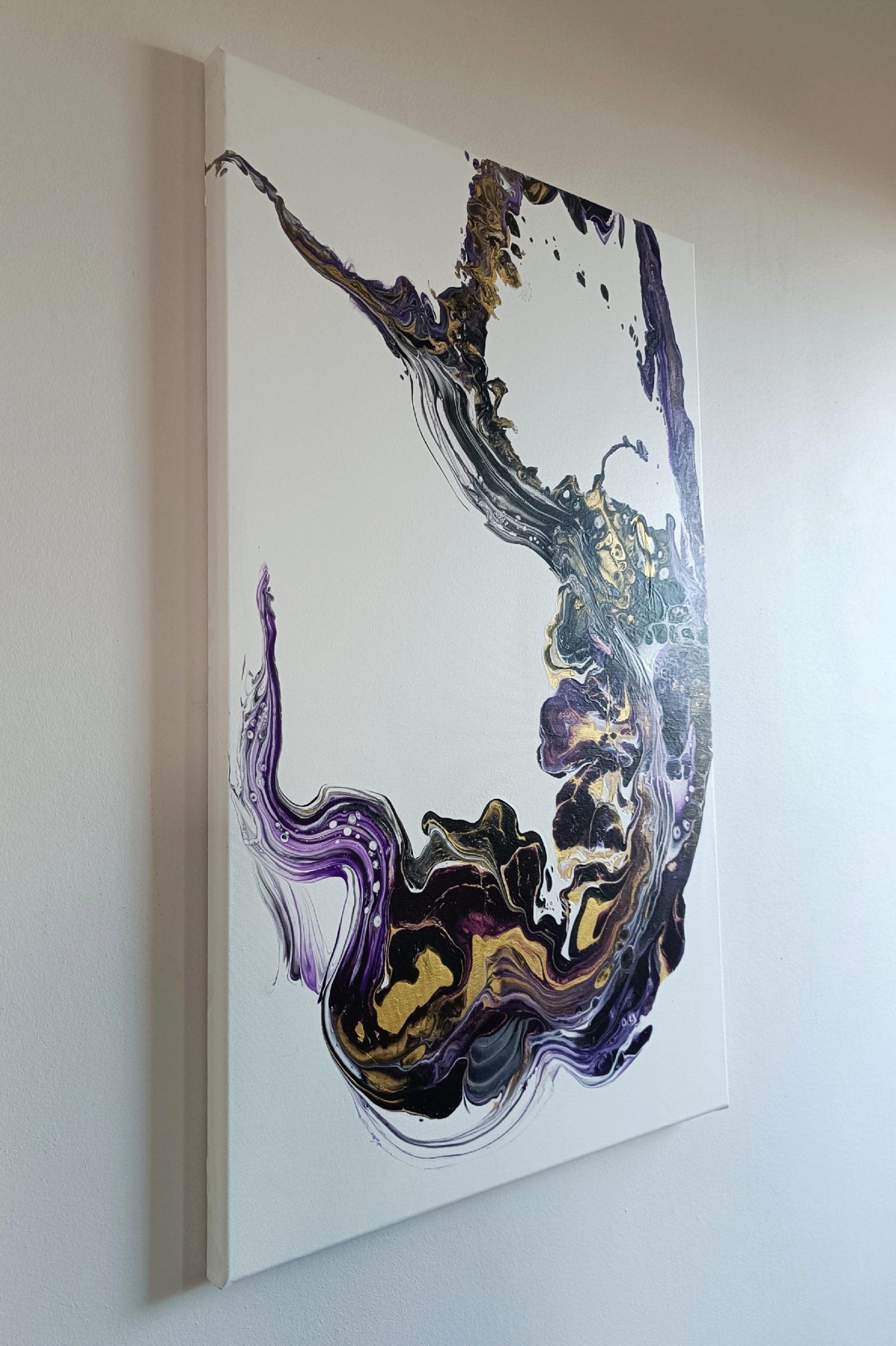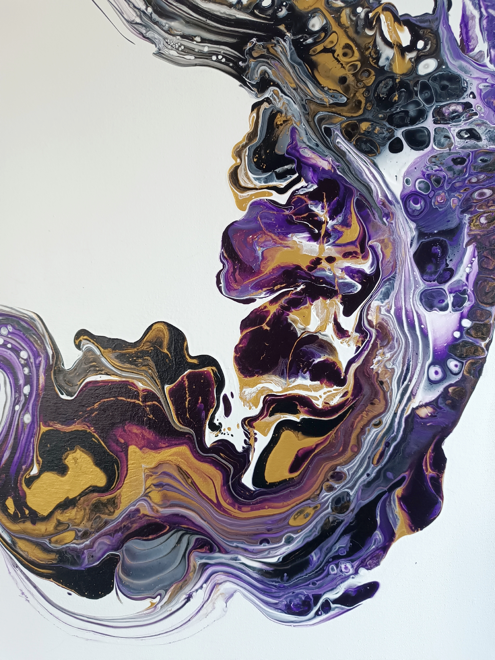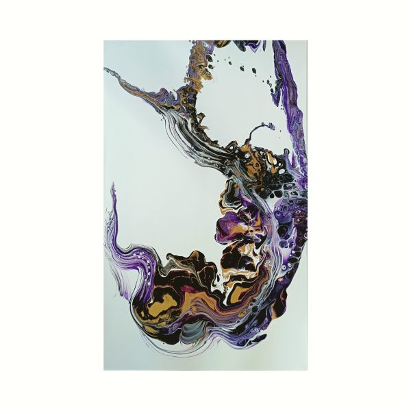 Obraz to metafora nowo narodzonego. Żywy dominujący fiolet ze złotym i czernią, kształtem przypominający noworodka. To artystyczna przenośnia nowego początku, dająca nadzieję i niosąca wielką radość, bo oto wyszłaś z być może najtrudniejszego okresu w swoim życiu.
